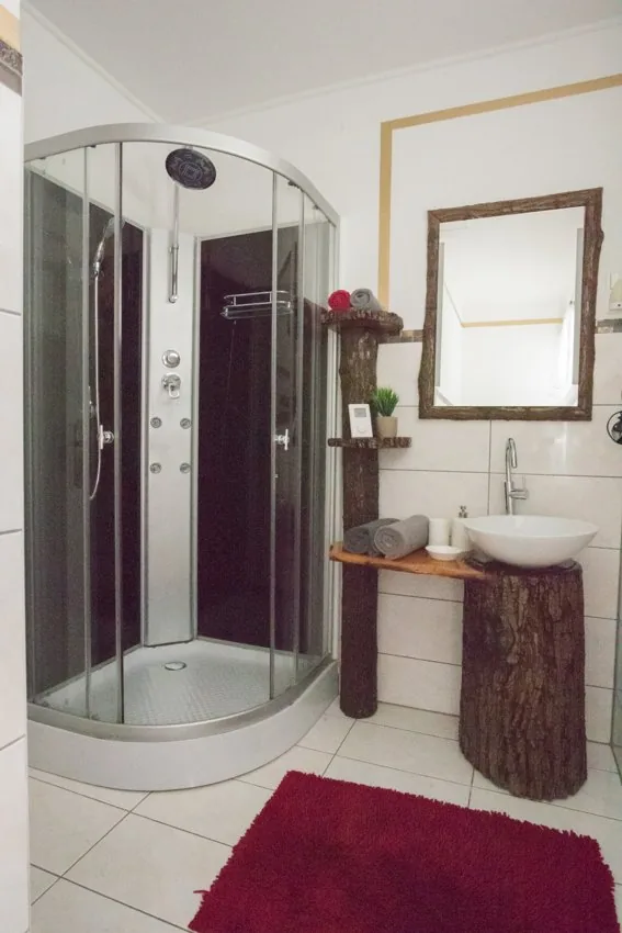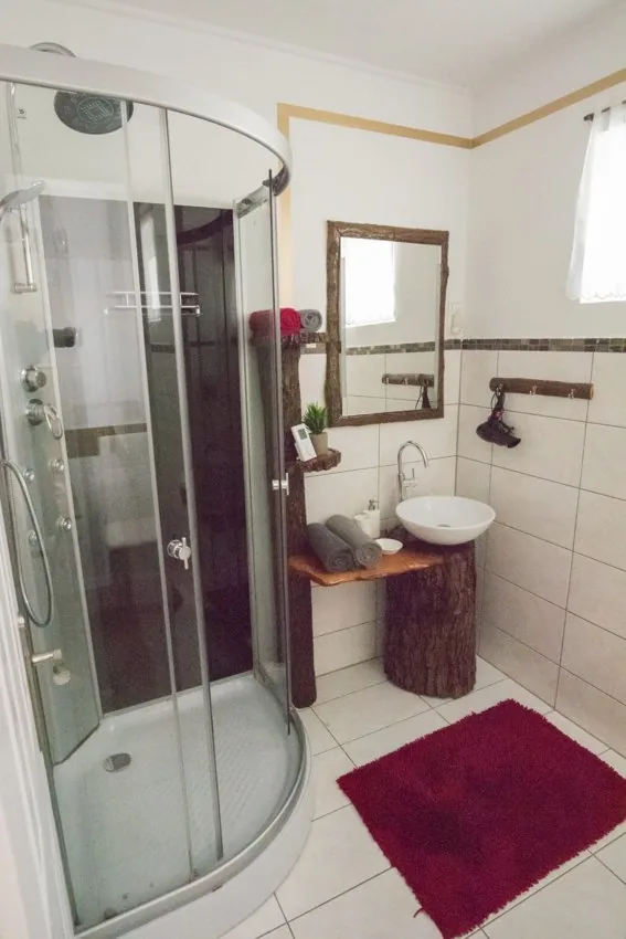 Das moderne Badezimmer überzeugt mit einer komfortablen Wellnessdusche inklusive mehrerer Massagedüsen – ideal, um nach einem erlebnisreichen Tag zu entspannen. Hand- und Badetücher sind selbstverständlich vorhanden.