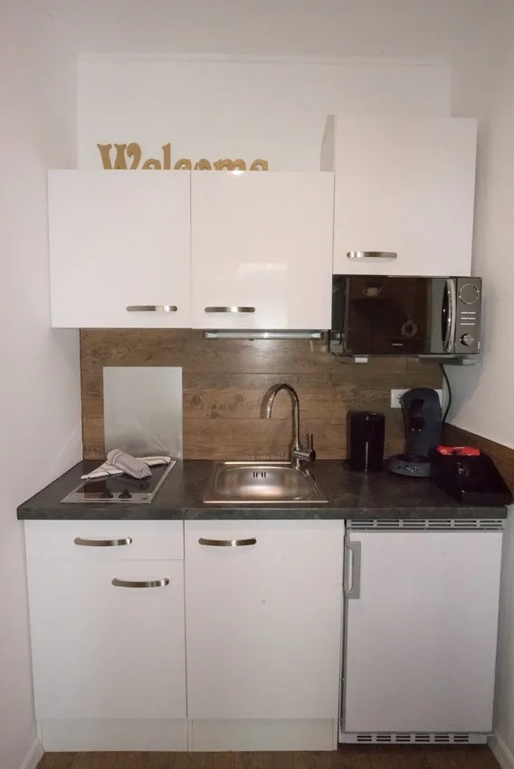 Die praktisch eingerichtete Küche verfügt über einen Kühlschrank, ein Cerankochfeld, einen Minibackofen sowie eine Mikrowelle – ideal für die Zubereitung kleiner Gerichte, zum Aufwärmen von Speisen oder für den kleinen Hunger zwischendurch. Eine Kaffeemaschine und ein Wasserkocher stehen Ihnen selbstverständlich ebenfalls zur Verfügung.