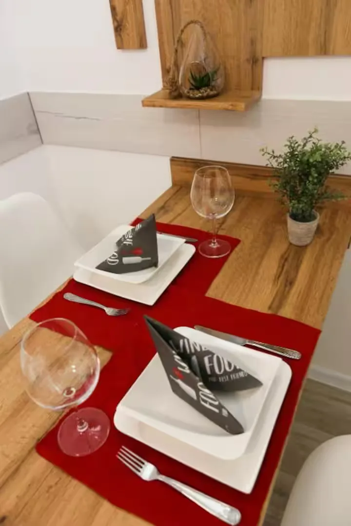 Der einladende Essbereich eignet sich perfekt für ein gemeinsames Frühstück oder ein gemütliches Abendessen. Geschirr und eine vollständige Küchenausstattung stehen Ihnen jederzeit zur Verfügung.